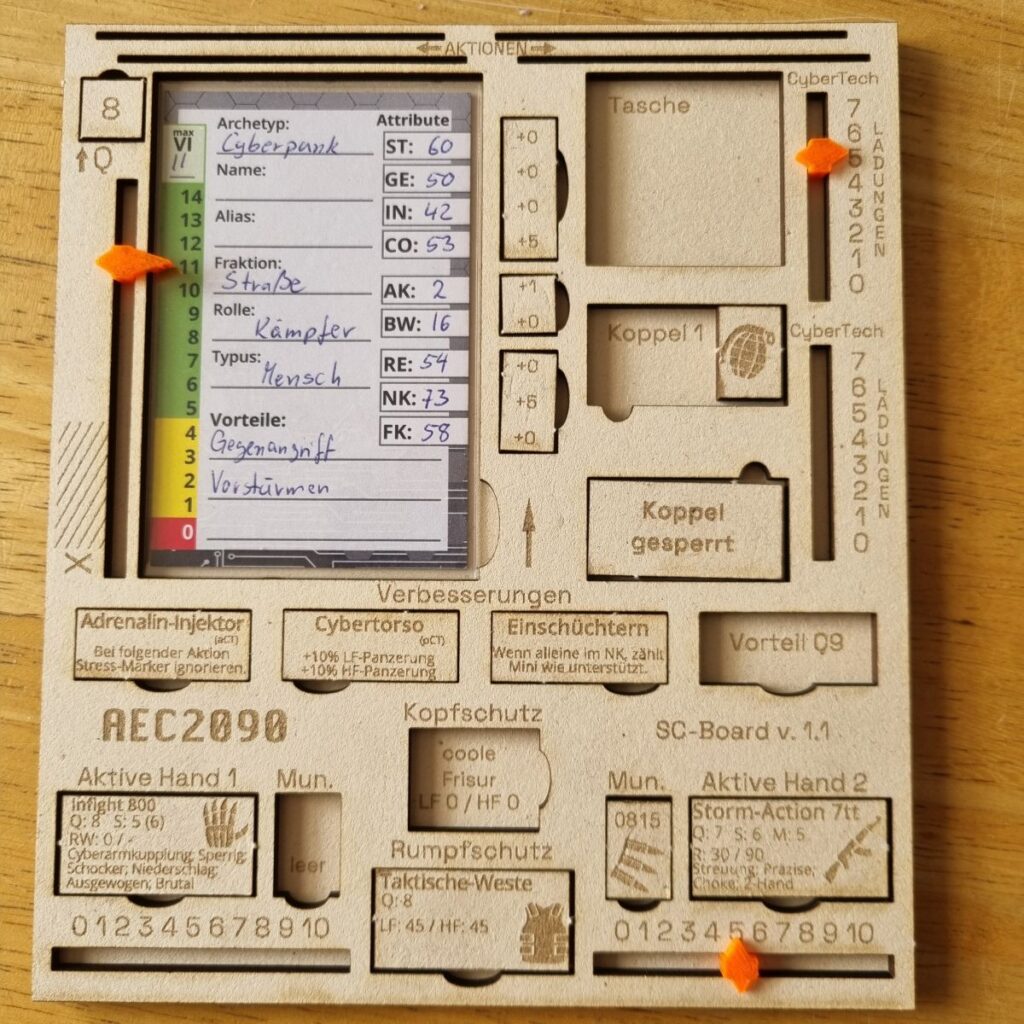 Auf dem Bild siehst du das Stat-Board der Cyberpunkerin. Alle Ressourcen-Einleger liegen da, wo sie hingehören.